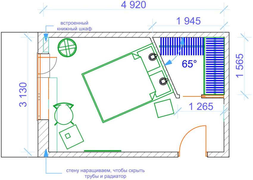Во всех других случаях планировка возможна только от входа с торца узкой гардеробной. Угловая гардеробная размером 1,2х1,8 будет оптимальна для спальни небольших размеров.
