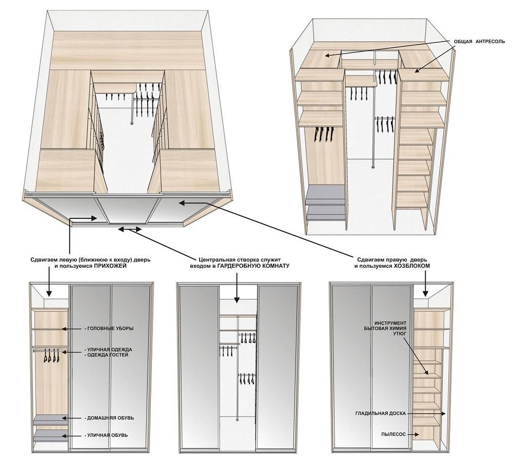 При планировании гардеробной комнаты учитывайте также правила зонирования (размещены в конце статьи).