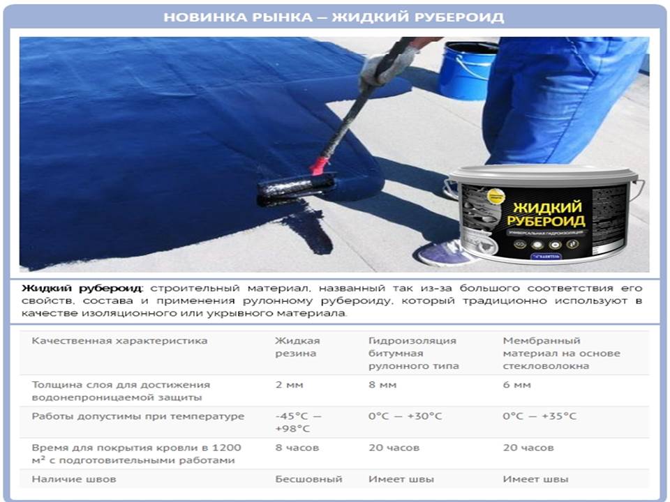 Достоинства мастик – хорошая адгезия с основанием, образование монолитной герметичной пленки. Под воздействием температуры воздуха эти материалы твердеют.
