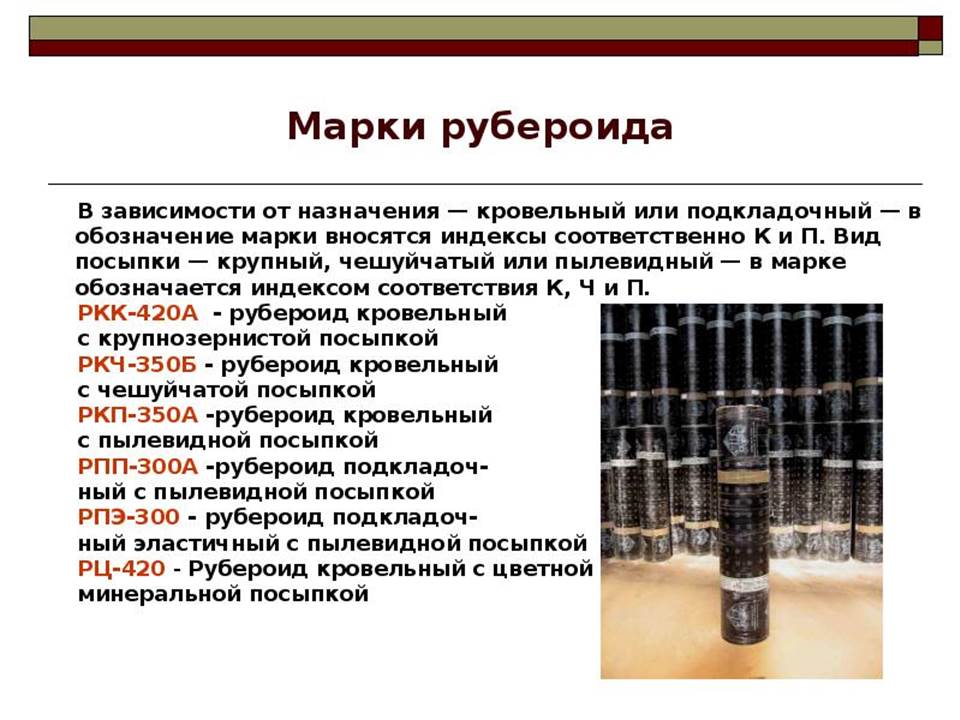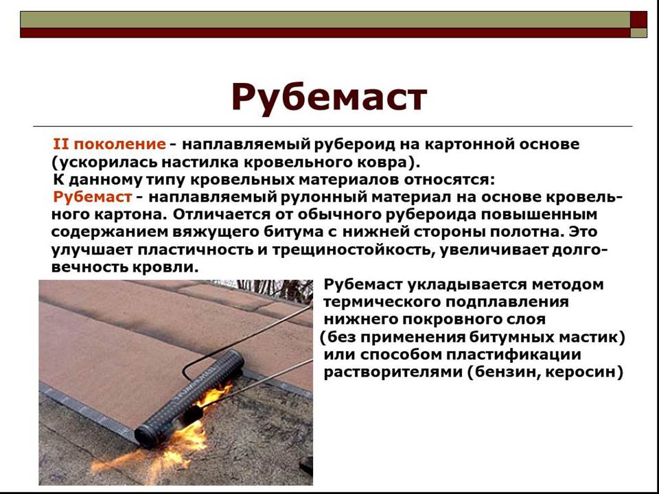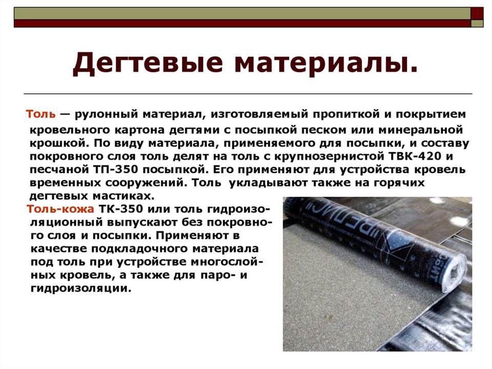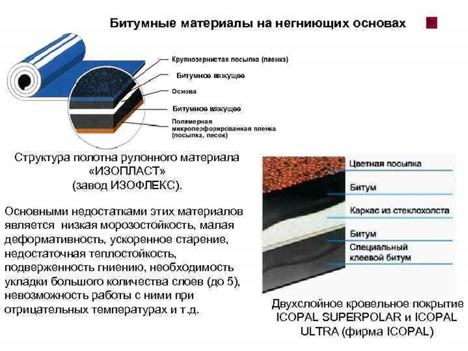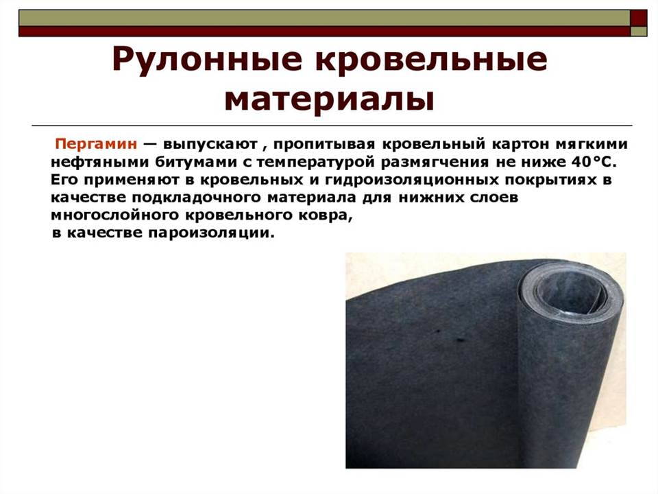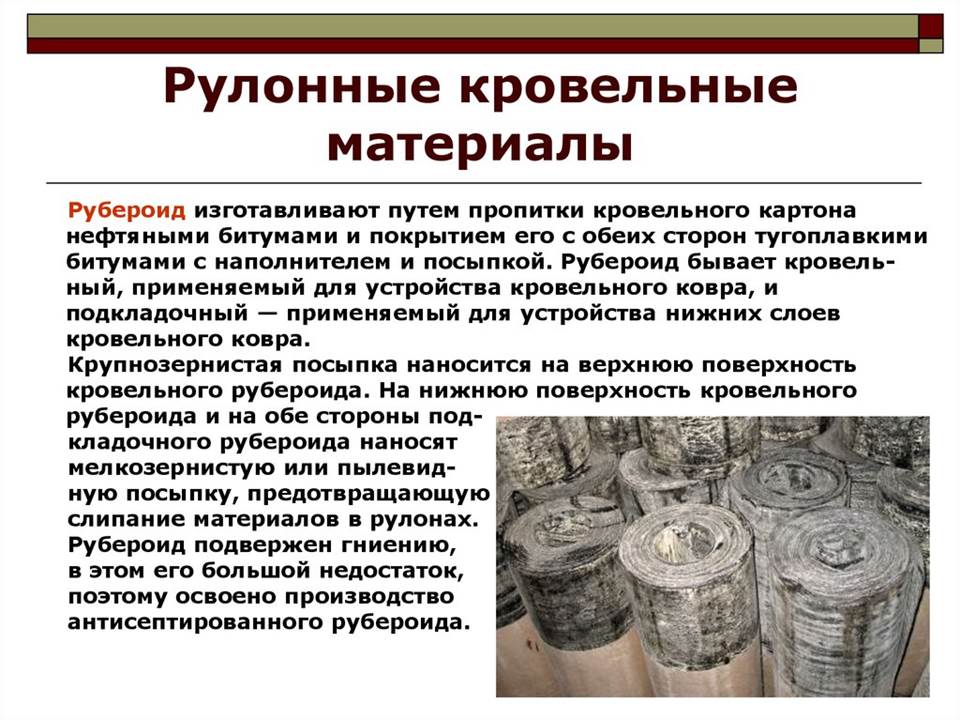 Наиболее привычные материалы: рубероид, толь, пергамин. Но эти материалы неводостойки, негнилостойки и недолговечны. Сейчас битум модифицируется полимерами, что значительно увеличивает его эластичность и теплостойкость.