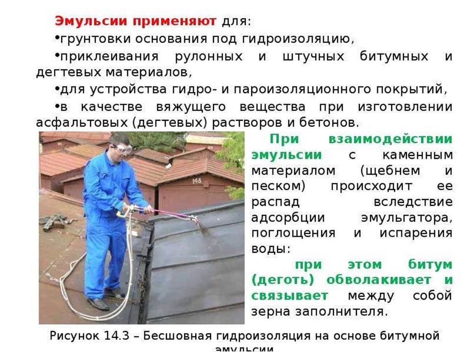 Минусы: применение горячих мастик сопряжено с повышенной пожароопасностью* (см. словарь терминов и определений).Поверхность перед покрытием должна быть обязательно высушена (допускается нанесение мастики на поверхности с влажностью не более 15%), очищена от пыли, масла и других загрязнений.