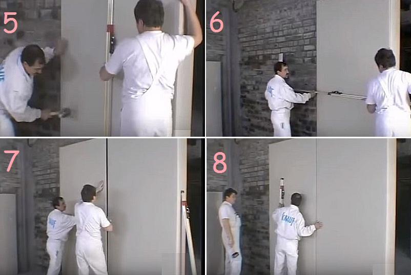 После фиксации первого ГК-листа к черновой поверхности, клеевой состав должен схватиться. Для этого надо лист зафиксировать дополнительно. Чтобы не держать лист возле стены час или больше, применяют дополнительное крепление: