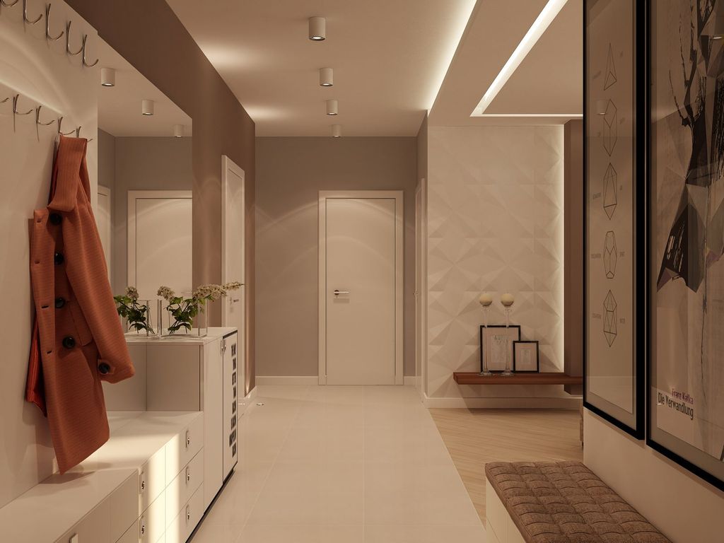 - В гостиной и коридоре можно дать волю фантазии(и деньги отделочникам) и сделать ниши с подсветкой, поиграть с темными цветами и декоративной штукатуркой. Можно, но не обязательно.