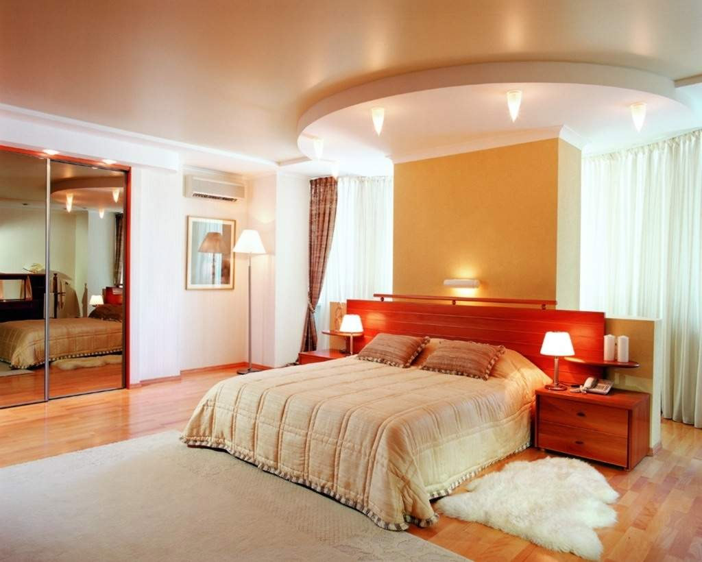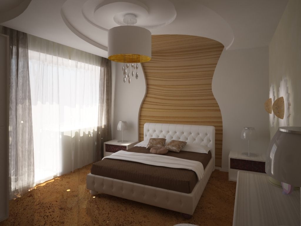 Любителей креативных интерьеров порадуют необычные фигурные потолки в спальне. Например, можно сделать короб в форме сердца или символического цветка, или просто сгладить резкость геометрии комнаты округлыми линиями.