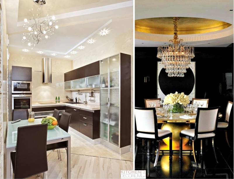 - Можно заново продумать освещение кухни – создать ниши для подсветки, установить точечные светильники в рабочей зоне, а над обеденным столом повесить люстру, как сейчас модно;