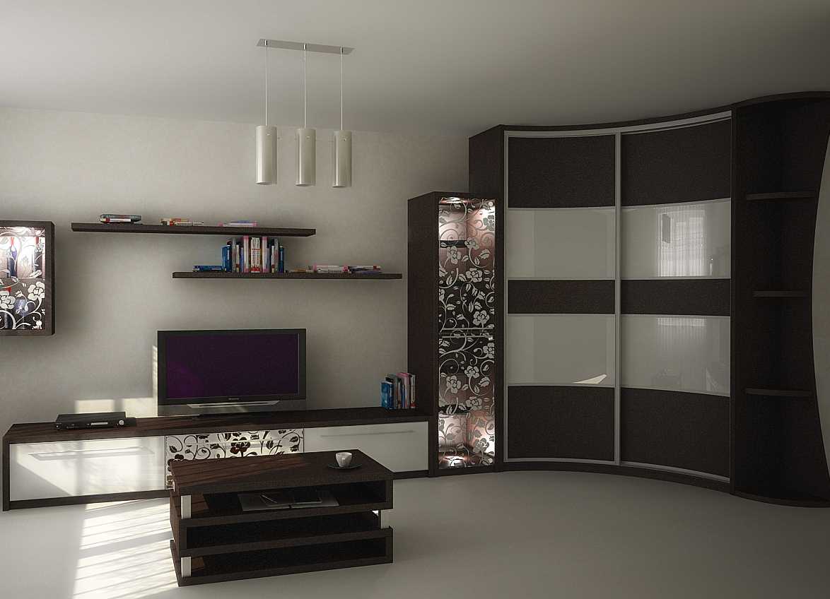 Респектабельно и солидно в интерьере зала выглядят овальные мебельные элементы, изделия, выполненные полукругом или конструкции с закругленными фасадами. Данные модели обладают плавными линиями и обтекаемой формой, что позволяет добиться более мягких переходов в дизайне зала.