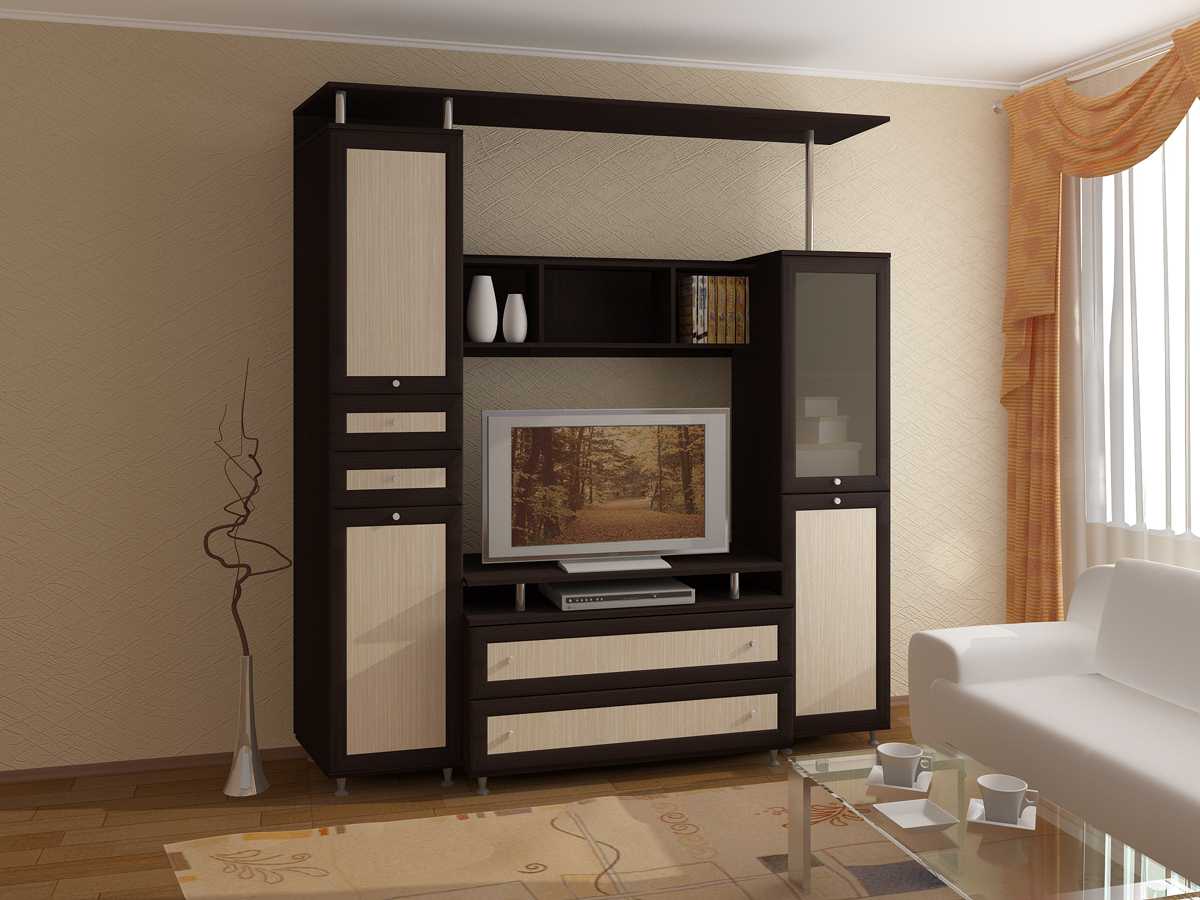 Мини-стенка станет отличным вариантом для малогабаритной квартиры. При этом несколько полок или модулей позволят хранить необходимые вещи. Миниатюрный вариант мебели, как правило, устанавливается под телевизор или другую бытовую технику.