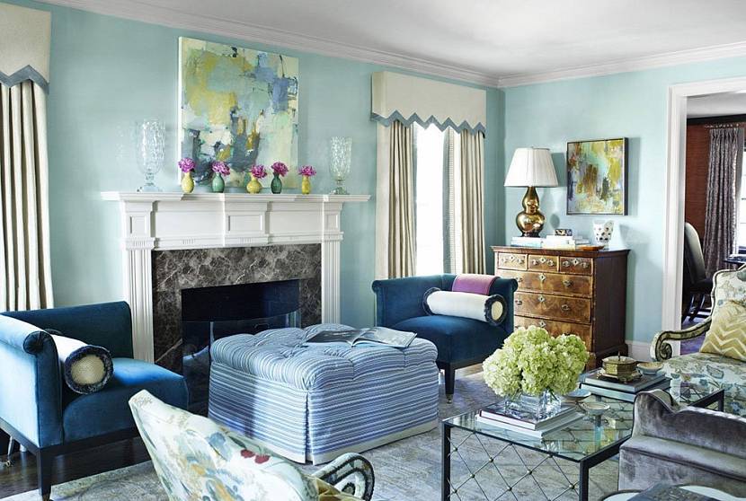 В голубом салоне хорошо смотрится винтажный стиль. Типичные узоры для материалов, простой мебели, керамики и светильников отражаются на голубых стенах, которые являются идеальным фоном для них.