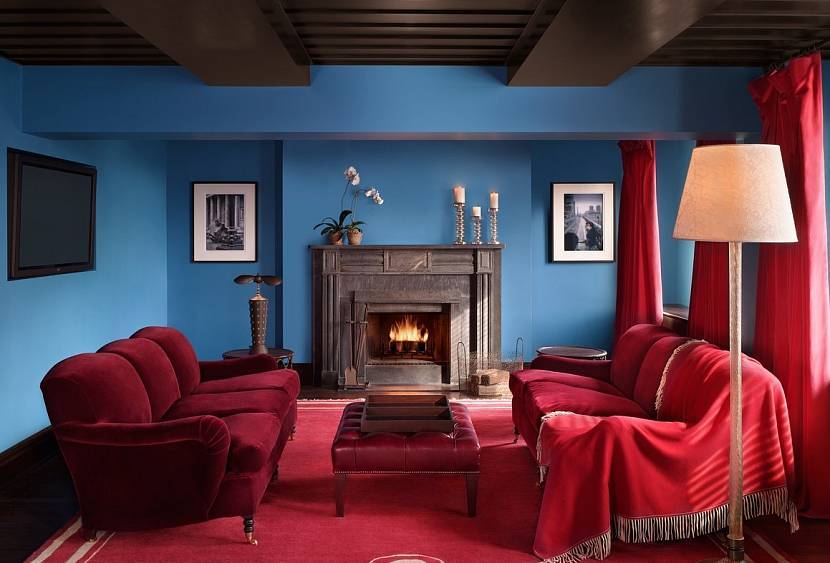 - Если вы являетесь поклонником необычных цветовых решений при оформлении стен гостиной, то вам может подойти редкое сочетание красного и голубого. Данное сочетание цветов по общему правилу считается недопустимым, однако если использовать его аккуратно, то можно добиться потрясающего эффекта.