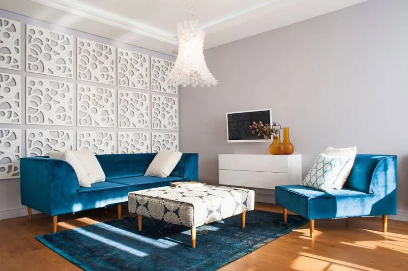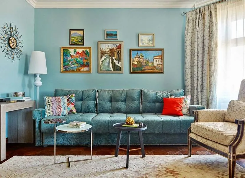 Голубые стены в гостиной могут быть окрашенными, оштукатуренными или же оклеенными обоями. Отделка может быть комбинированной, монохромной или же разноцветной: