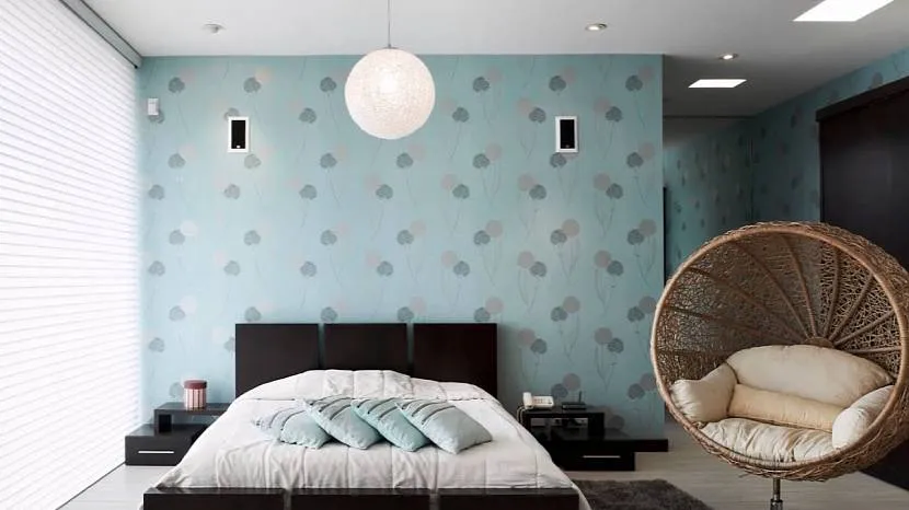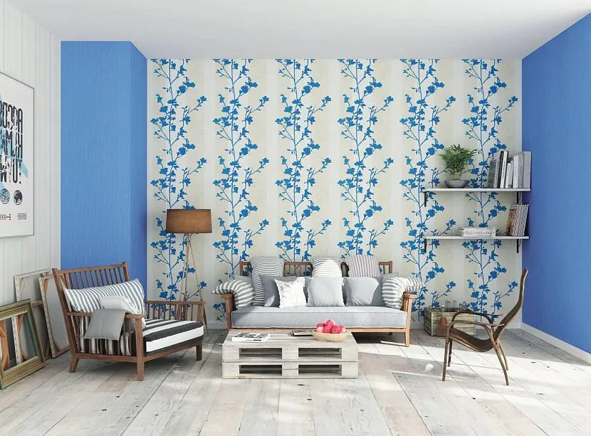 Современные направления дизайна обычно используют однотонные покрытия, хотя и здесь есть место для исключений. Трендом последних лет стало использование макросъемки: голубые обои в интерьере функциональной гостиной служат декором. Это может быть снимок разлетающегося одуванчика, набросок будто карандашом растения или птиц, крупный рисунок нескольких лепестков. Выполненный в небольшом диапазоне одного основного цвета узор смотрится стильно, ненавязчиво и элегантно. Но такой будет только одна акцентная стена, остальные должны быть однотонными – в основном оттенке или же в тональности компаньона.