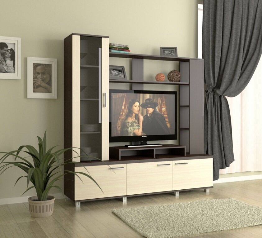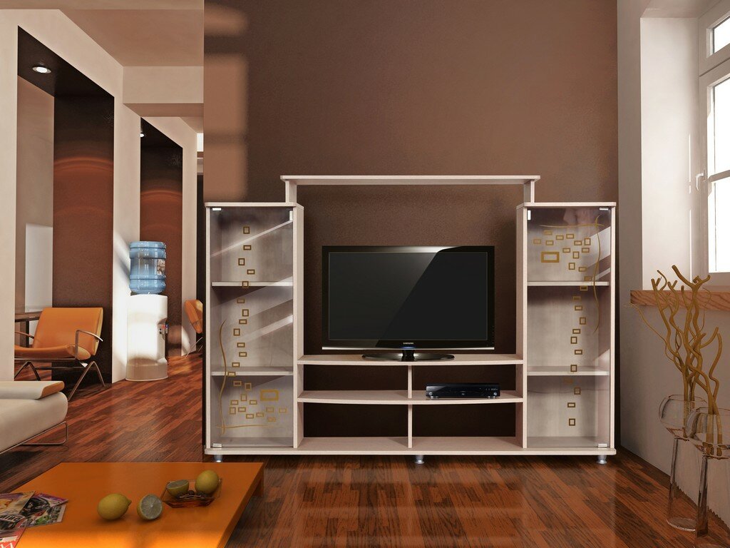 . Наиболее подходящим и практичным вариантом мини-горки будет стенка с отделом под телевизор и небольшими полочками для книг и мелких аксессуаров. Такой вариант будет стоить совсем недорого, но подчеркнет стиль интерьера и обеспечит выгодное использование пространства.