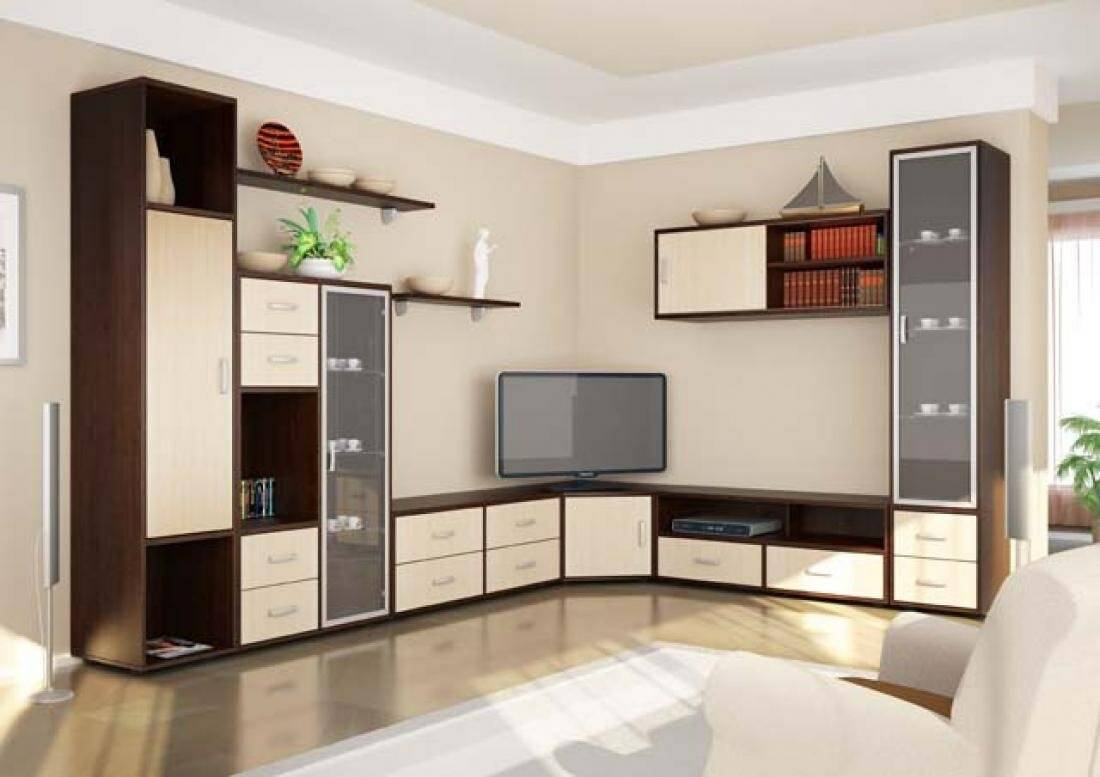 Мебельная стенка, использующая свободное пространство угла – решения для практичного хранилища вещей. При планировки интерьера углы комнаты никаким образом не используются, с данной горкой можно это исправить и рационально воспользоваться углом. Такая идея отлично подходит для малометражных квартир, в которых регулярно возникает проблема с размещением вещей