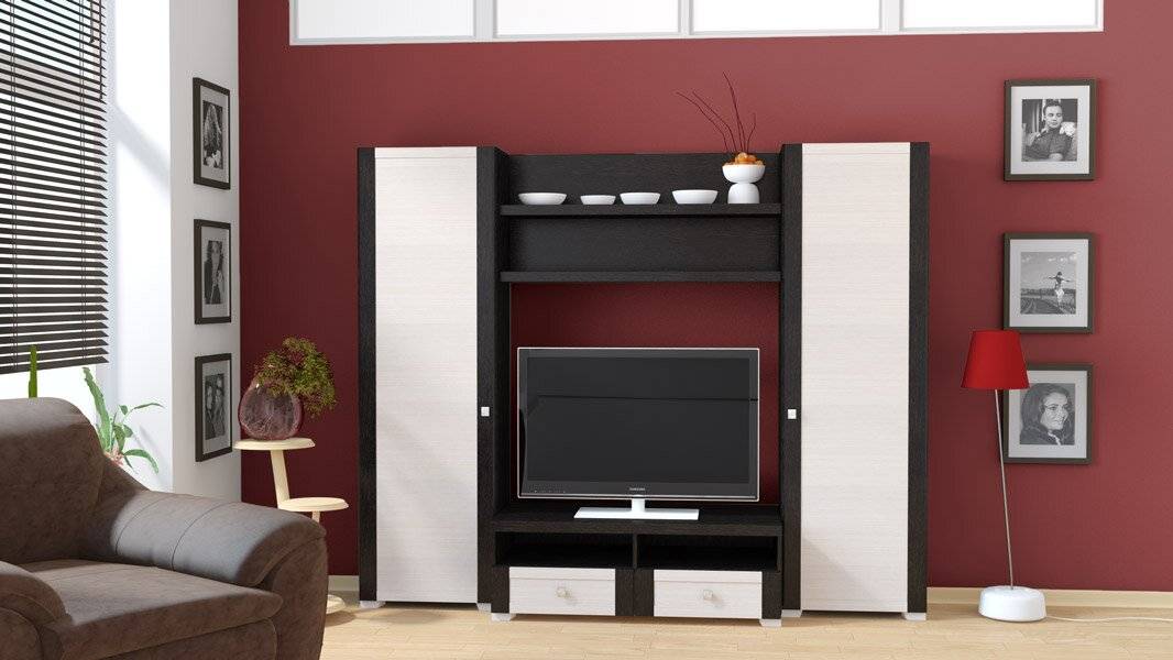 Этого достаточно, чтобы спрятать одежду, поставить телевизор, разместить периферию. Встречаются мини-стенки 3 типов: