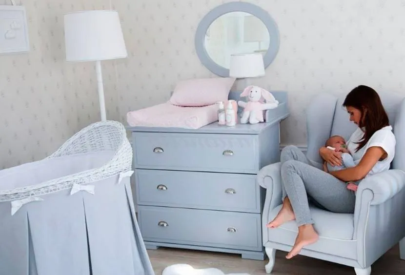 Вместительные системы используются для хранения вещей, подгузников и аксессуаров. Выбор мебели зависит от размера спальни. В «хрущевку» впишется пара тумбочек; Высокий (до 1,5 м) узкий комод поместится в просторной комнате. Колесики вместо ножек облегчат перемещение предметов интерьера по комнате.