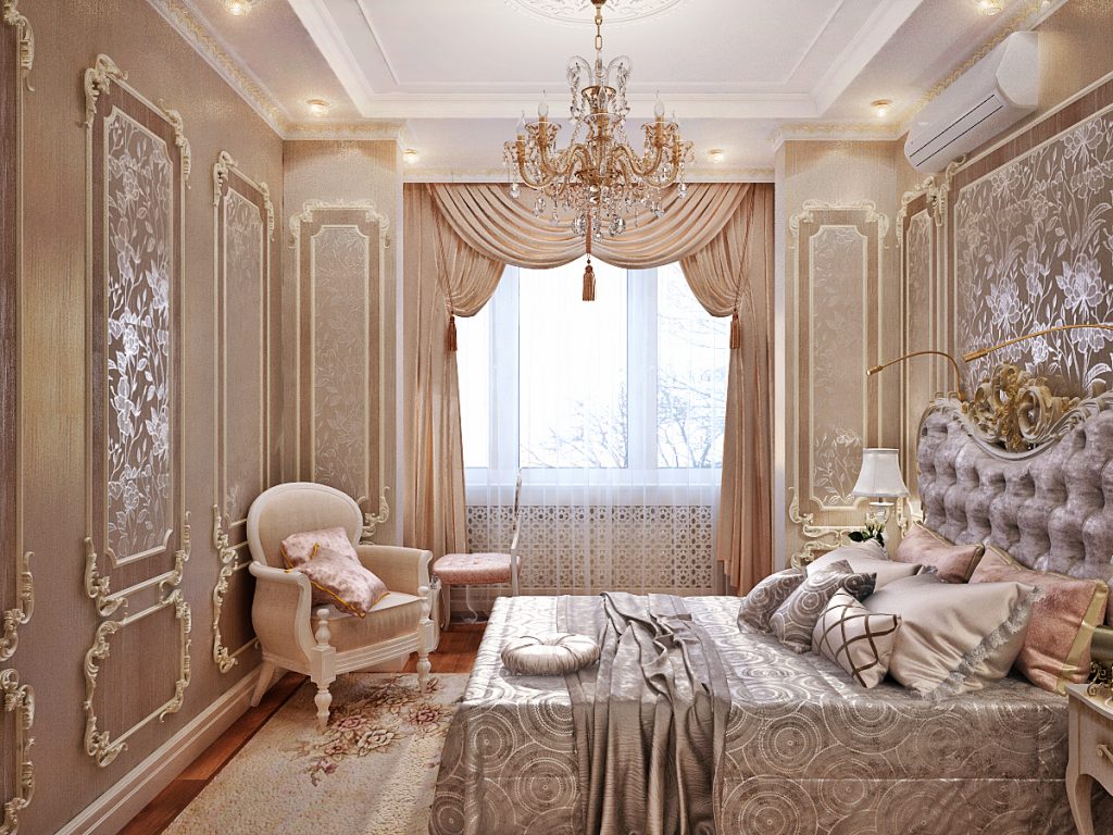Все предметы мебели должны сочетаться между собой по цвету и стилистическому оформлению. Также они должны соответствовать цветовому оформлению спальни. Чаще всего предпочтение отдает белому цвету, бежево-коричневой гамме. Для декорирования стен и мебели используется позолота.