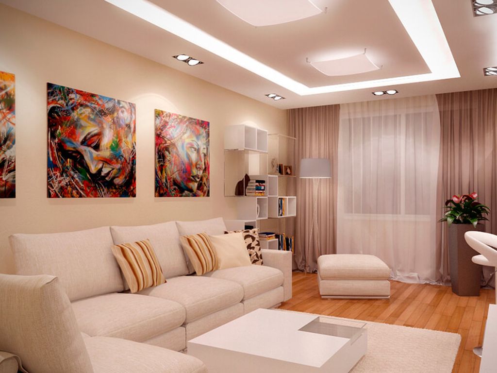 Для декорирования потолочной плоскости уместно использование покраски, натяжных полотен или сложносоставных гипсокартонных конструкций, со встроенными точечными светильниками или подсветкой. Светлый потолок смотрится более привлекательно и легко. Отличным решением для бежевой гостиной станет потолочная отделка в белых тонах или оттенках айвори.