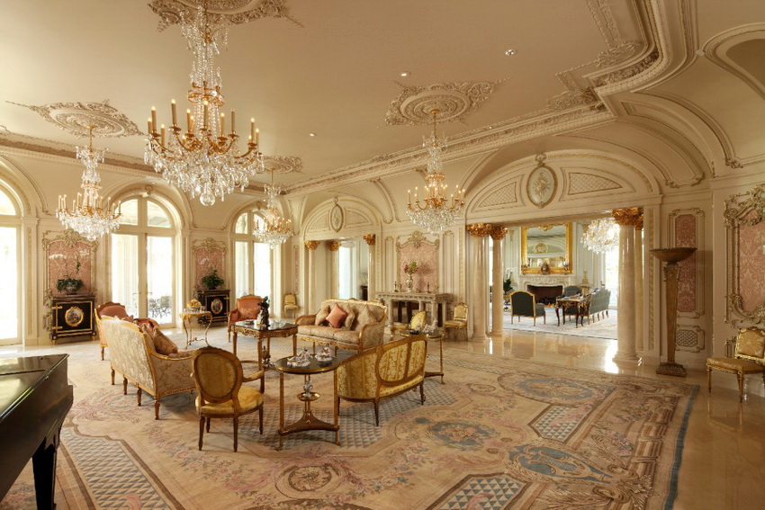 Лучше всего смотрится гостиная классического стиля в светлых нейтральных тонах, на таком фоне ярче выделяется декор. Позолота отлично сочетается с деревом или оттенками белого. Хорошо смотрится в интерьере красное дерево.
