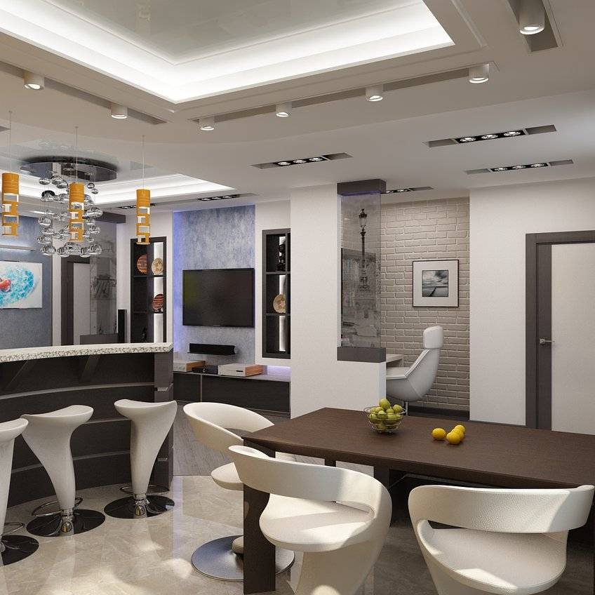 Стильные кресла, стулья из металла и пластика и встроенные модули — это то, что вам нужно увидеть в первую очередь. На маленькие площади лучше всего оформлять предметами трансформерами.