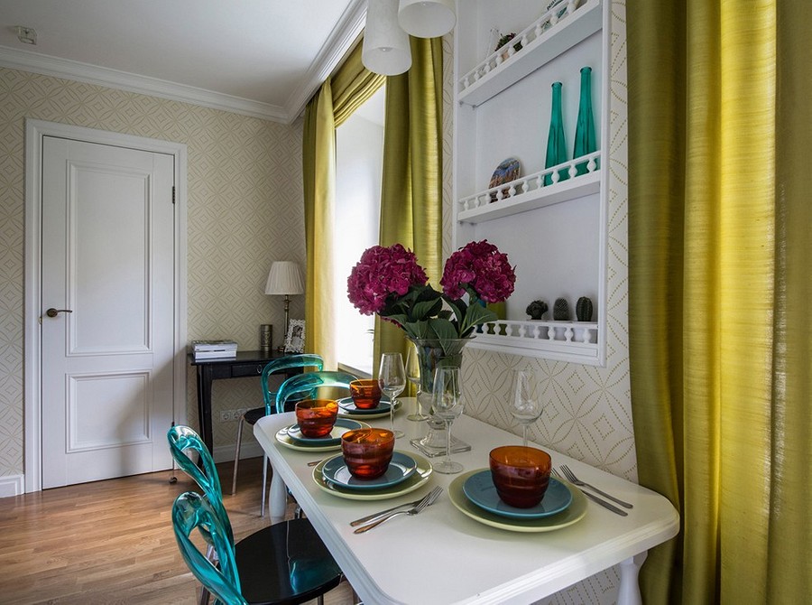 Здесь помещение воздухом и светом наполнят светлые и натуральные древесные тона. Планировка хрущевок заставляют использовать каждый метр. Для небольших помещений идеальны линейные или Г-образные кухонные гарнитуры. В хрущевке уместна будет барная стойка с различными навесными элементами и зоной хранения под столешницей. Подоконник можно превратить в раскладной или откидной стол, используя все пространство комнаты по максимуму. Можно сделать гостиную, трансформирующуюся в столовую с помощью журнального столика, который превращается в полноценный обеденный стол.