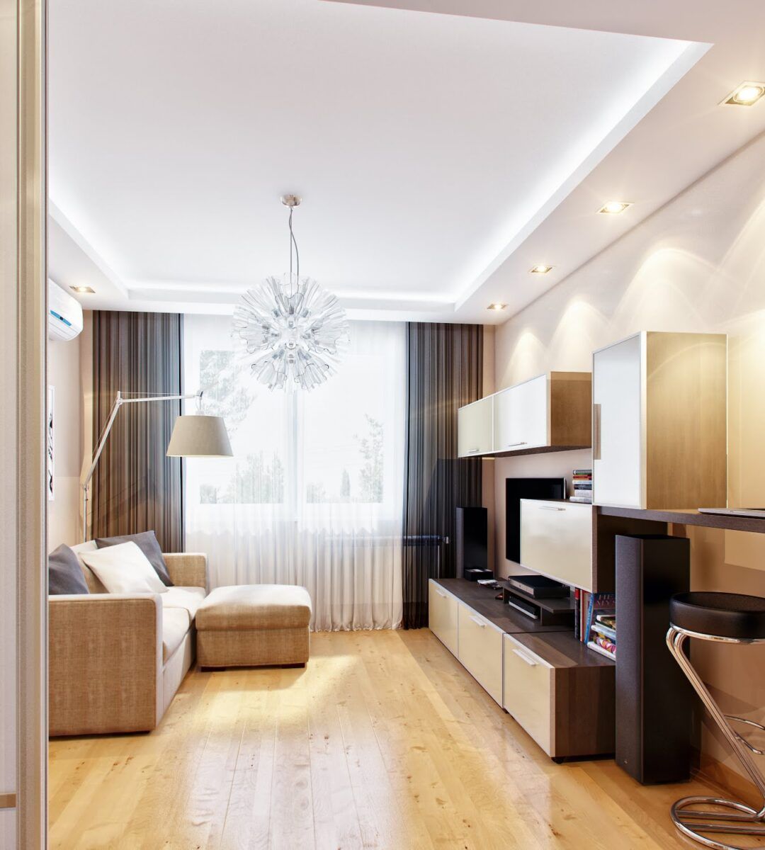 Если гостиная очень маленькая, можно рассмотреть вариант объединения ее с кухней или балконом. В первом случае следует позаботиться о мощной вытяжке, чтобы запахи готовящейся еды не мешали домочадцам отдыхать. При объединении зала с лоджией или балконом специалисты советуют как следует утеплить балконную стену и пол.