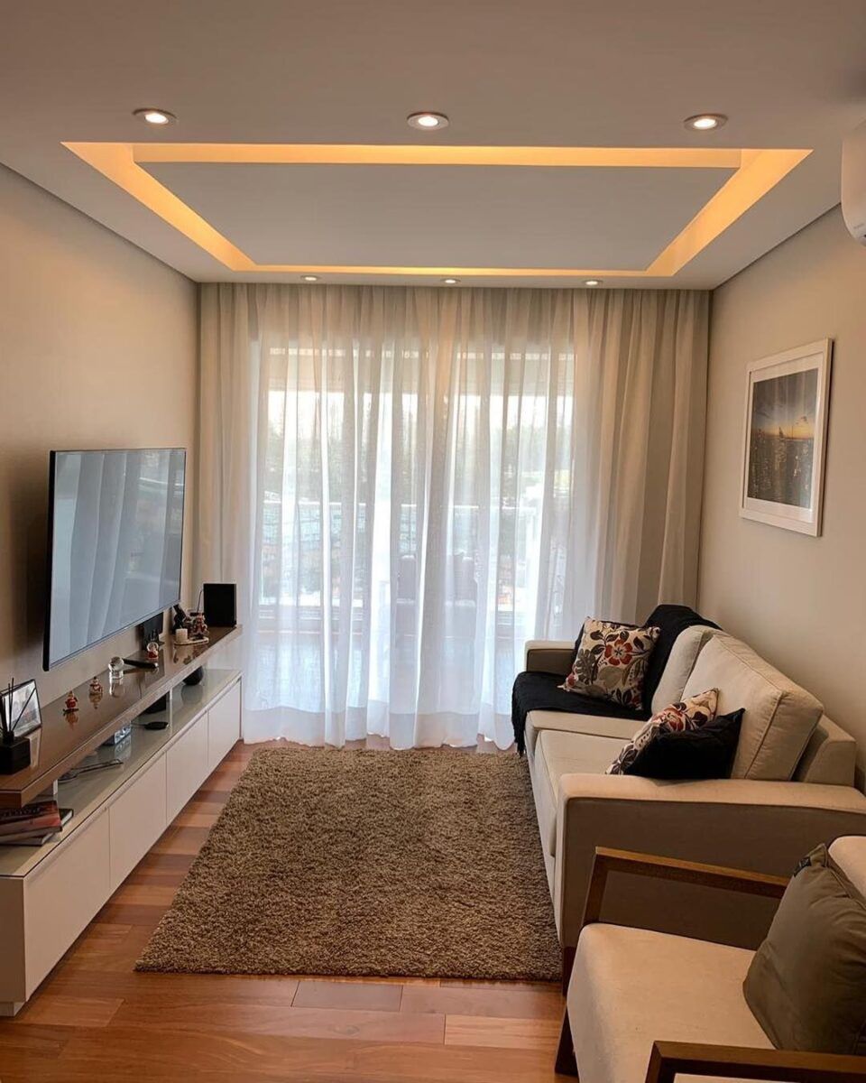 В квадратном помещении, дизайнеры рекомендуют заранее определить где будет располагаться меблировка и декор. Лучше если все предметы будут размещены на равном друг от друга расстоянии. В гостиной в форме квадрата нет необходимости выбирать специальное место для мебельного гарнитура, так как его расположение никак не повлияет на уменьшение зала. Основным достоинством данной планировки является экономия свободной площади в центре помещения.