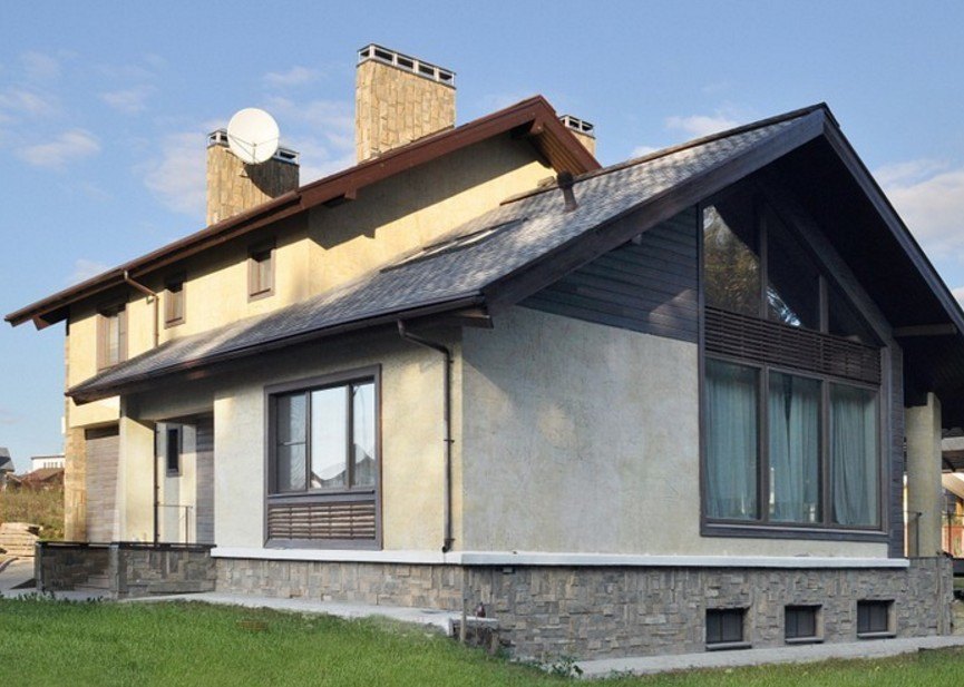 Фасадные работы предполагают очистку стен от остатков раствора, клея и последующее их покрытие отделочным материалом. Среди наиболее популярных видов фасадных материалов, применяемых при сооружении дома в стиле шале, выделяются: