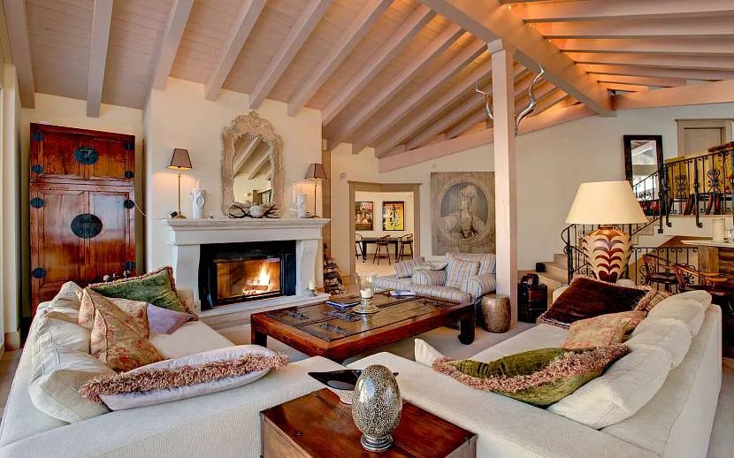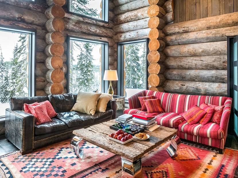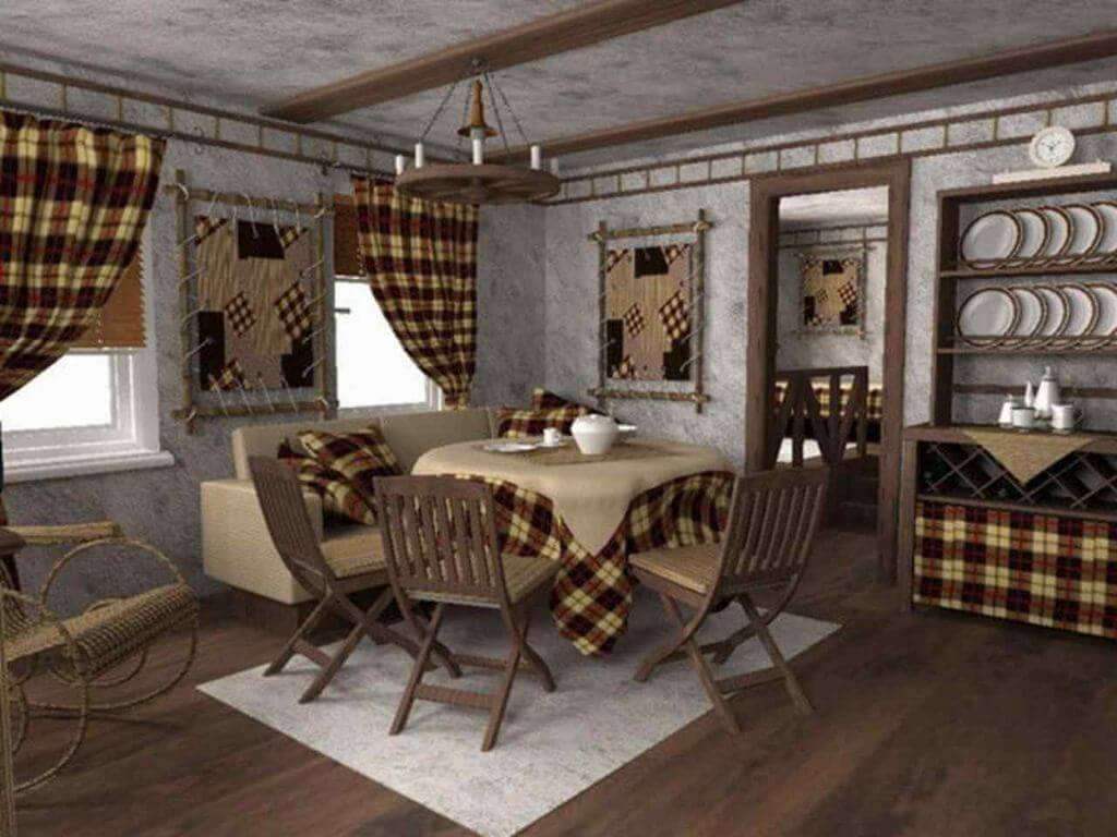 Истоки стиля лежат в простой деревенской жизни, поэтому в гостиной всегда уместен домотканый текстиль, ковры и покрывала ручной работы с этническими мотивами. Классическим же декором считаются шкуры и диванные подушки, которые могут играть роль акцента.