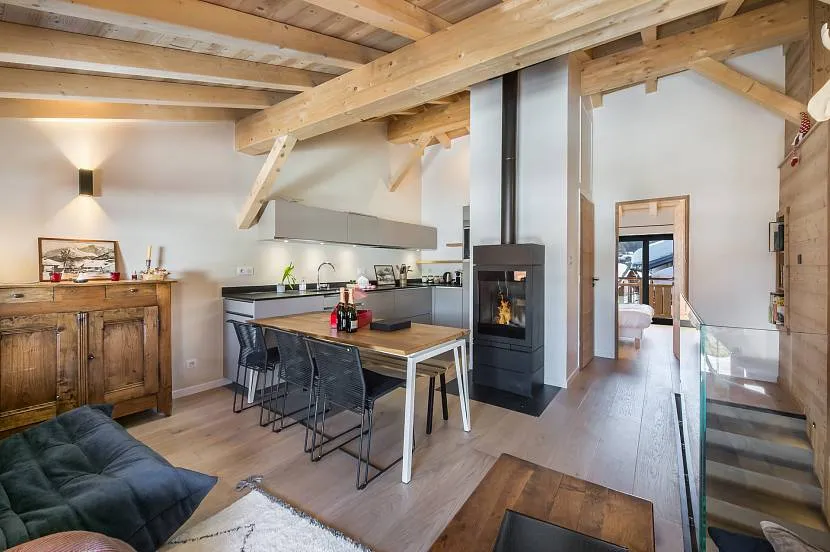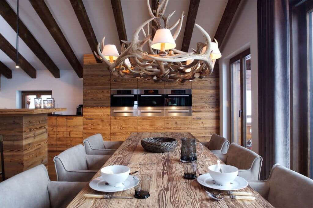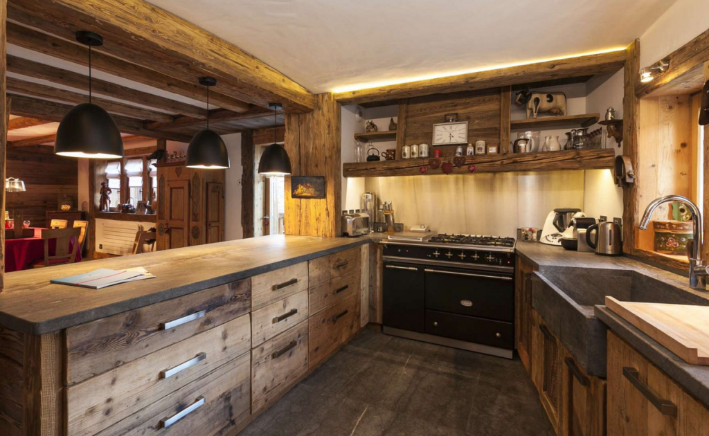 Объединение нескольких пространств в одно (когда кухня совмещается с гостиной) — характерная черта стиля, и подобное решение больше подходит для загородного дома. Такая кухня-гостиная в стиле шале зонируется при помощи предметов мебели, света или различной по цвету и текстуре отделки.