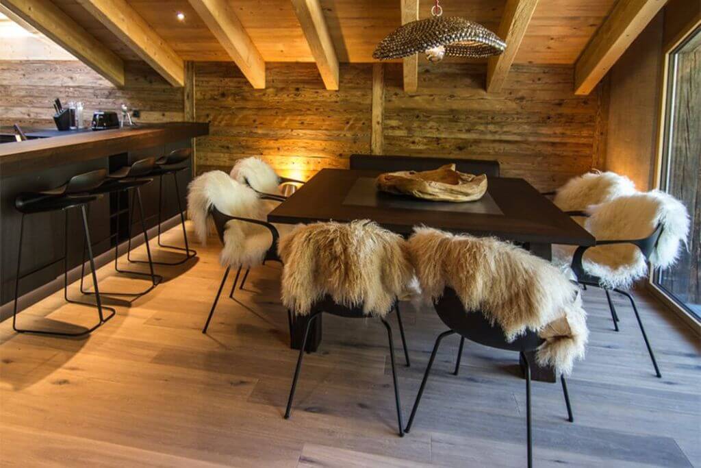 Как вы видите, большинство шале имеет множество натуральных материалов, таких как дерево и камень, а также кожу в составе мебели, а затем мех и шерсть в аксессуарах.