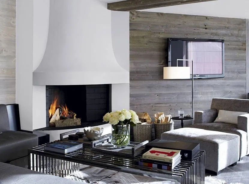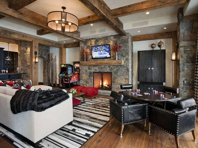 На фоне искусственно состаренных деревянных и каменных поверхностей смотрится необычно. Подобные дизайнерские решения могут быть применены в любой комнате. Наиболее характерны они для гостиной шале.