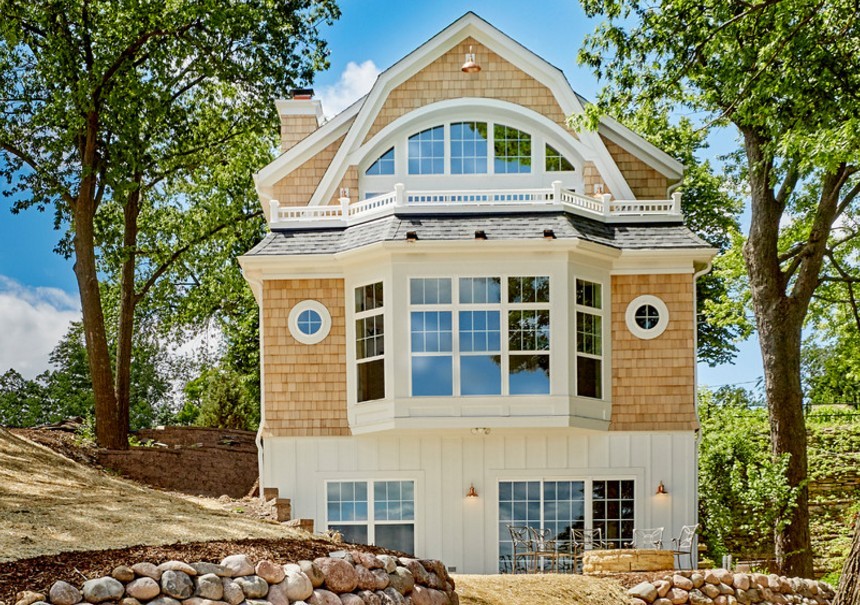 Максимальное слияние с природой достигается, благодаря наличию открытых балконов и террас. От солнечных лучей и дождя такие балкончики защищаются с помощью продолжения покатых крыш. Периметр подобных конструкций принято обшивать модными элементами из дерева, декорировать балюстрадами или фигурными дощечками.