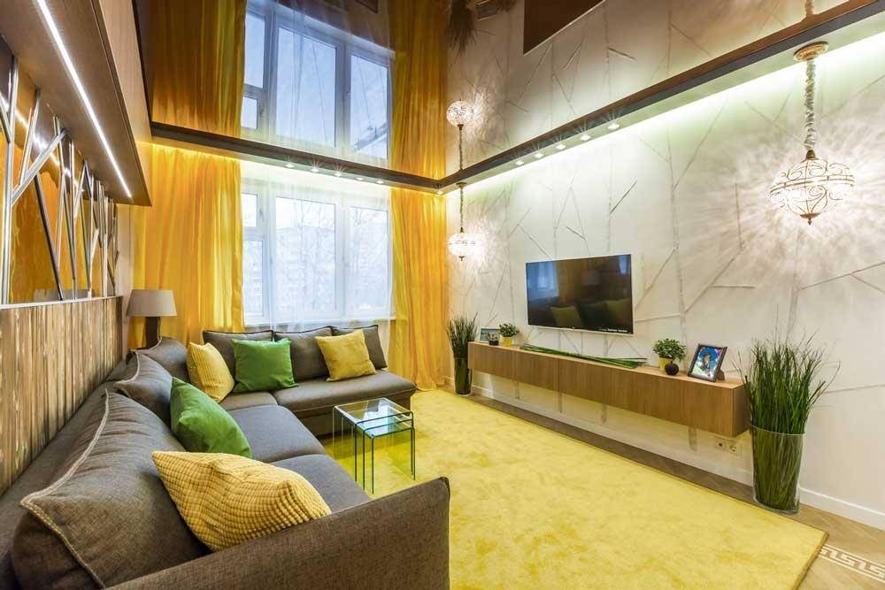 - При отделке помещения стоит использовать горизонтальные и вертикальные линии для визуального увеличения пространства. Примером может послужить глянцевый натяжной потолок или гипсокартоновый с несколькими уровнями.