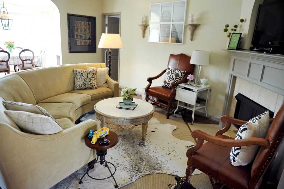 Если гостиная совсем маленькая, то можно выбрать диван без подлокотников, чтобы на него можно было садиться с любой стороны. Если же гостиная имеет очень сложную форму, что, к сожалению, встречается во многих домах старой постройки, то вместо дивана в большинстве случае лучше выбрать комплект кресел.