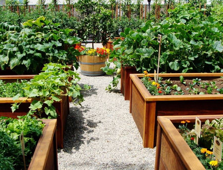 К деревянным грядкам обеспечивают подход дорожками с твердым покрытием