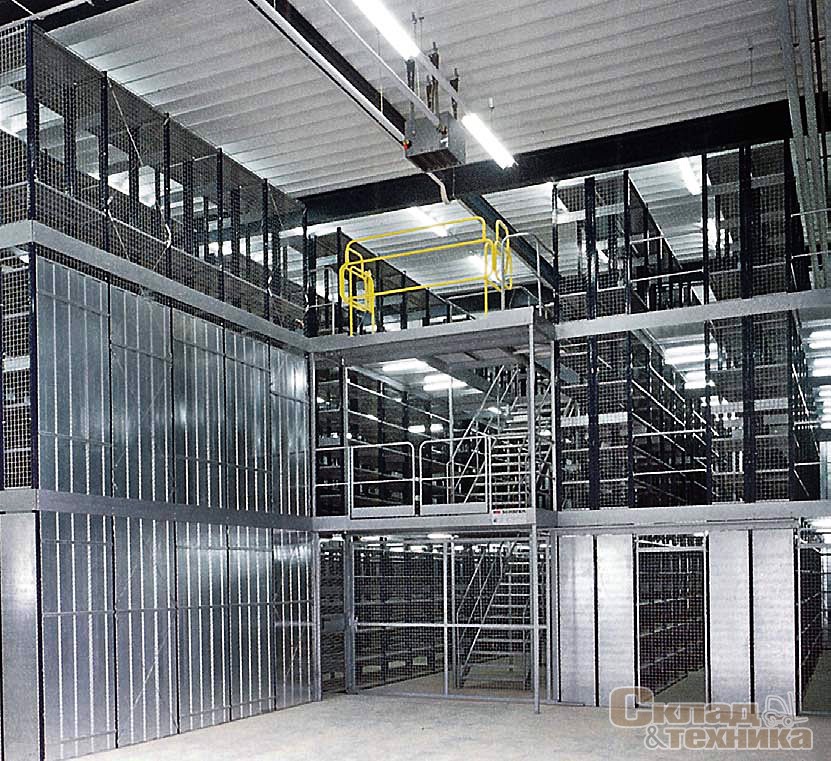 За счет возведения новых этажей такая система хранения позволяет в 2…3 раза увеличить пространство, предназначенное для складирования и перемещения товара. Таким образом, мезонин можно использовать и в качестве зоны хранения товара, и для комплектации. Базовыми для такого рода конструкций являются стеллажи для поддонов, состоящие из рам (стоек) и горизонтальных балок, которые образуют стандартные паллетные уровни складирования. Они дополняются специальными несущими стойками, на которые крепят балки под настил (площадку мезонина). Балки в зависимости от нагрузки могут быть выполнены из трубы прямоугольного профиля либо из двутавра или катаного профиля с другим‚ более сложным‚ замкнутым сечением. Все вертикальные несущие стойки жестко крепятся между собой, образуя устойчивую конструкцию. Площадки мезонина по желанию заказчика могут быть изготовлены из металла, металлической решетки, фанеры или деревянного настила. Доступ на этажи мезонина осуществляется с помощью лестниц, оснащенных перилами. Так как площадка для работы находится, как правило, на высоте более 2 м, лестницы должны быть двухмаршевыми, с площадкой для отдыха. Ступени лестницы изготавливают из рифленого листа, чтобы исключить скольжение. Края площадки мезонина, не замкнутые секциями стеллажа, для безопасности работающего персонала обязательно оборудуют металлическими ограждениями (поручнями) высотой не менее 0,8 м. Поскольку загрузку-разгрузку мелкофасованного товара проводят вручную, для подъема людей и груза на высоту мезонина обычно применяют грузовые подъемники (лифты), которые могут быть установлены стационарно или передвигаться по мере необходимости вдоль периметра мезонина.