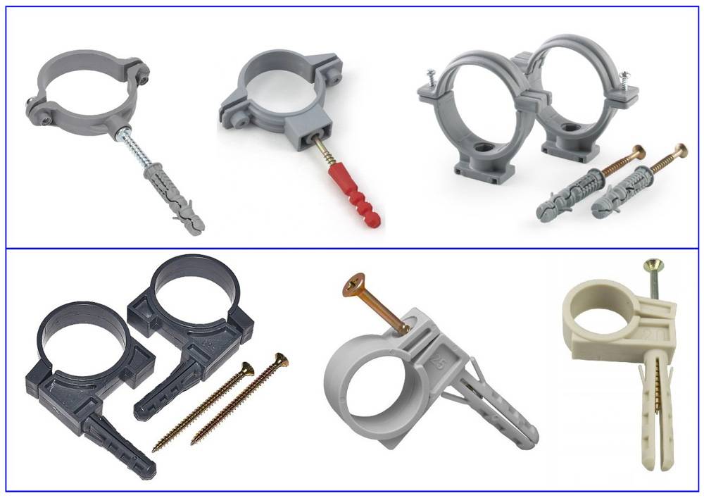 Клипсы. Пластиковый хомут для труб в виде клипсы крепят в стену на дюбель с винтом, после чего в него вставляют трубу. За счет гибкости и пластичности клипсы она прочно удерживается в крепеже. Клипсы незаменимы при креплении полипропиленовых труб отопления, проложенных вдоль стен и подходящих к радиаторам. Высоким спросом пользуются спаренные модели, рассчитанные на одновременное прикрепление двух трубопроводных 25 мм или 32 мм линий.