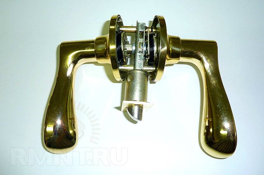 - Нажимные дверные ручки – это наиболее популярный вариант для монтажа в межкомнатных дверях, как в квартире, так и в частном доме. Устанавливаются они с помощью штифта, который проходит через дверное полотно. Дверь надежно закрывается, так как язычок входит в проем дверной планки. Суть такой модели заключается в том, что открытие двери осуществляется при нажатии на ручку. Она может быть соединена с замыкающим механизмом, а может, и нет, все зависит от определенной модели.