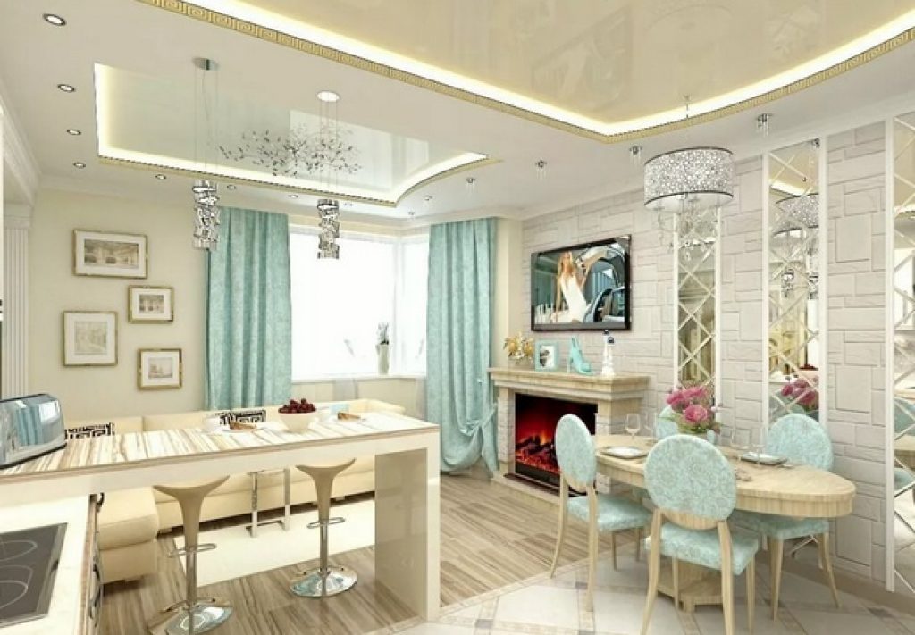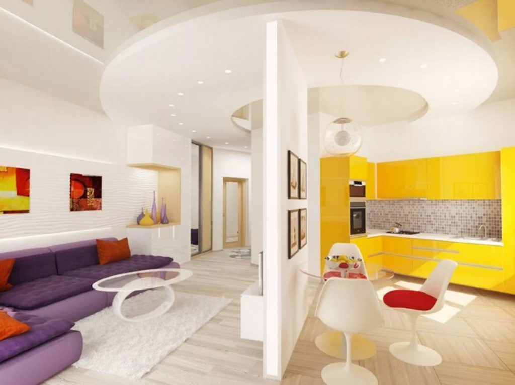 Отделка потолка также входит в дизайн кухни-гостиной. Это способствует визуальному разделению территорий. Здесь применяются подвесные конструкции разных контуров: прямые, дугообразные, изогнутые и прочие. Причем, разные уровни могут отличаться расцветкой, рисунком, текстурой и другими признаками.