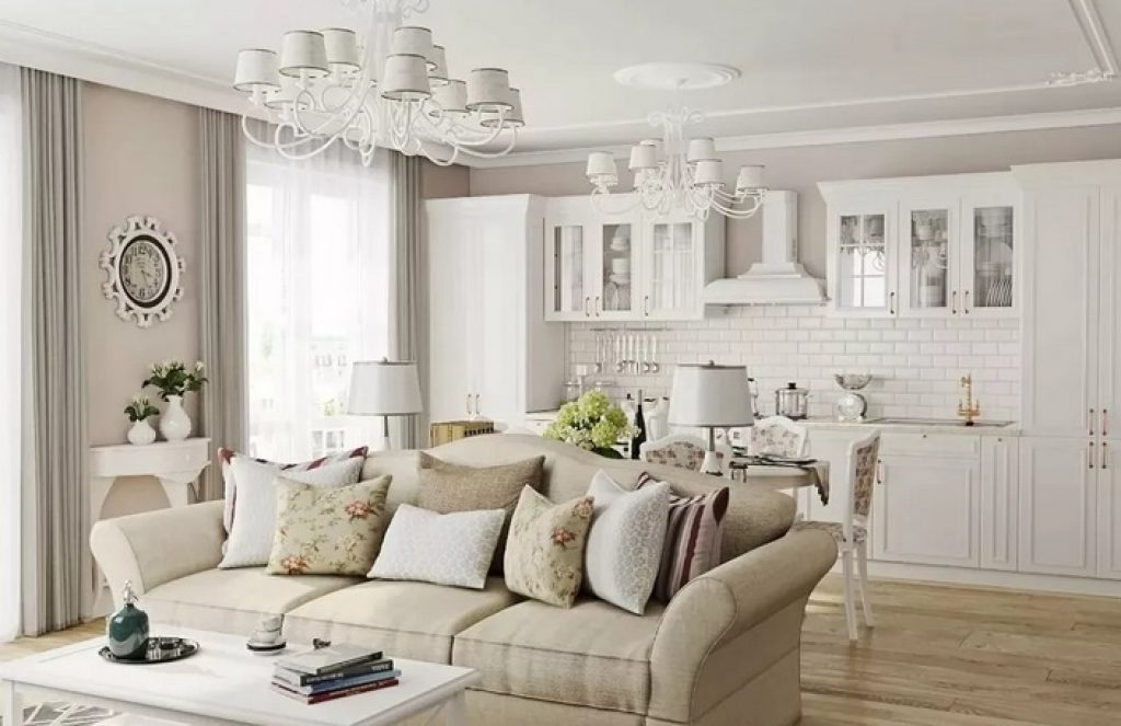 Гораздо проще выбрать палитру, если стиль для кухни с гостиной ужу подобран. Например, для неоклассики и прованса характерны свои сочетания. В классическом интерьере дизайнеры сочетают пастельную гамму, бледные цвета, которые слегка разбавлены темными оттенками.