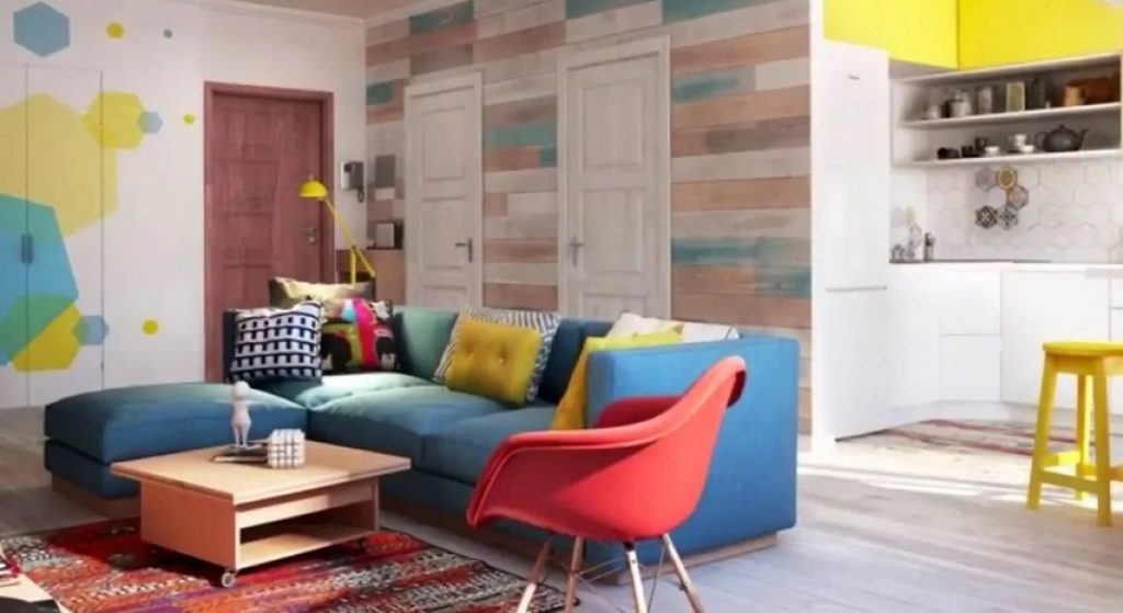 Аксессуары и текстиль могут добавить вашему интерьеру изюминки и красок. Гостиная, объединённая с кухней фото которой вы увидите ниже, имеет яркие акценты в декоре на общем фоне с помощью грамотно подобранной палитры цветов.