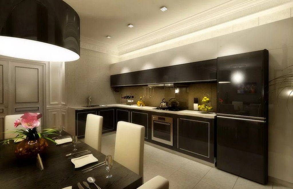 Лучше всего заранее детально продумать способы освещения комнат, так как с помощью дополнительных источников света можно также выделить функциональные зоны. Как говорилось выше, это может быть освещение потолка и подиума, а также встроенные лампы в мебели и по периметру помещения. Интерьер гостиной, совмещенной с кухней должен объединять в себе хорошо освещённую кухонную рабочую зону и иметь возможность использовать приглушённый свет в периоды отдыха в гостиной.