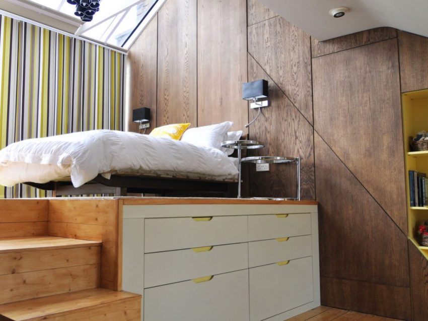Кровать-подиум сочетает в себе оригинальный дизайн, удобство и функциональность — мебель для маленькой спальни фото