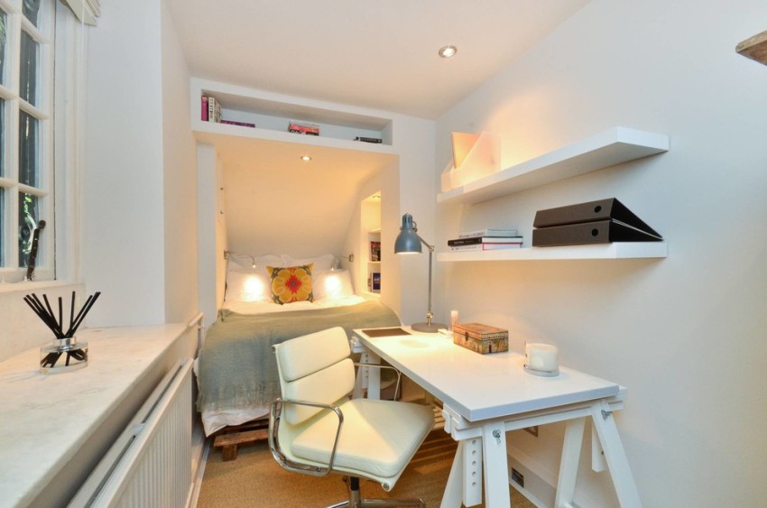 Если желаете задействовать компактную спальню не только для сна и отдыха, а, например, и в качестве домашнего кабинета, установите здесь складывающуюся кровать. Сложив ее на день, вы максимально освободите пространство. Перед сном просто разложите спальное место, и комната вновь станет удобной для отдыха.