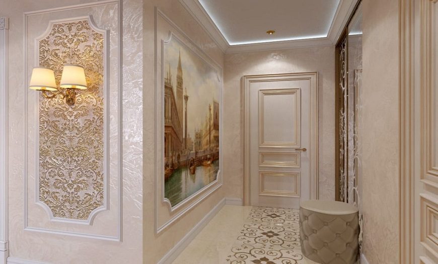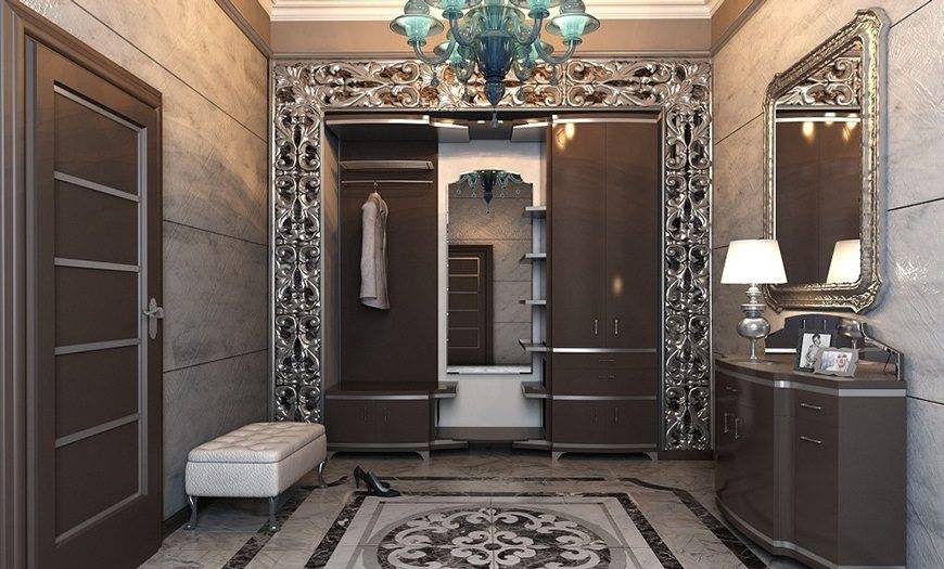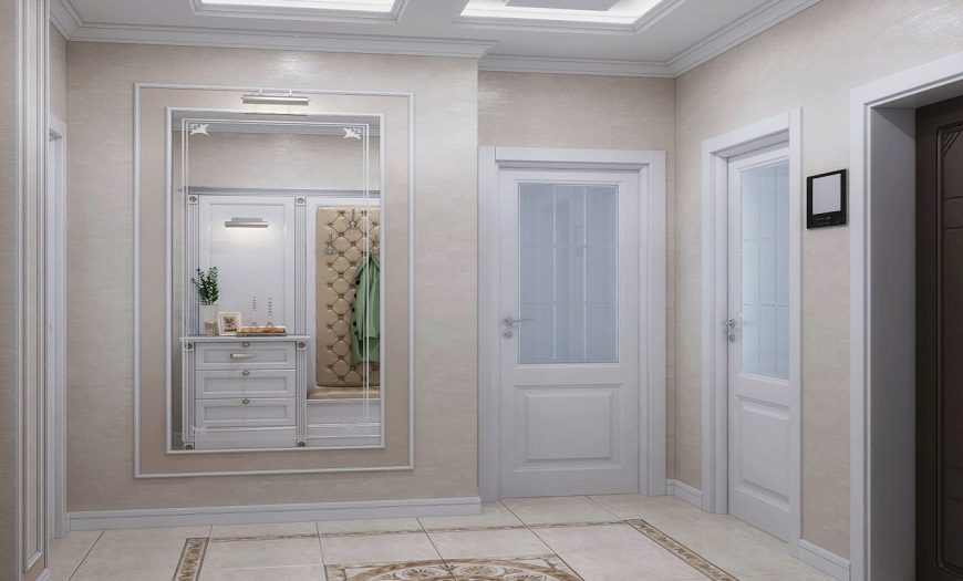 Можно постелить ковер с оригинальным рисунком. Такой же узор наклеить на стену и потолок. Качественные стеновые панели и зеркальная стена — идеальные варианты оформления интерьера прихожей.