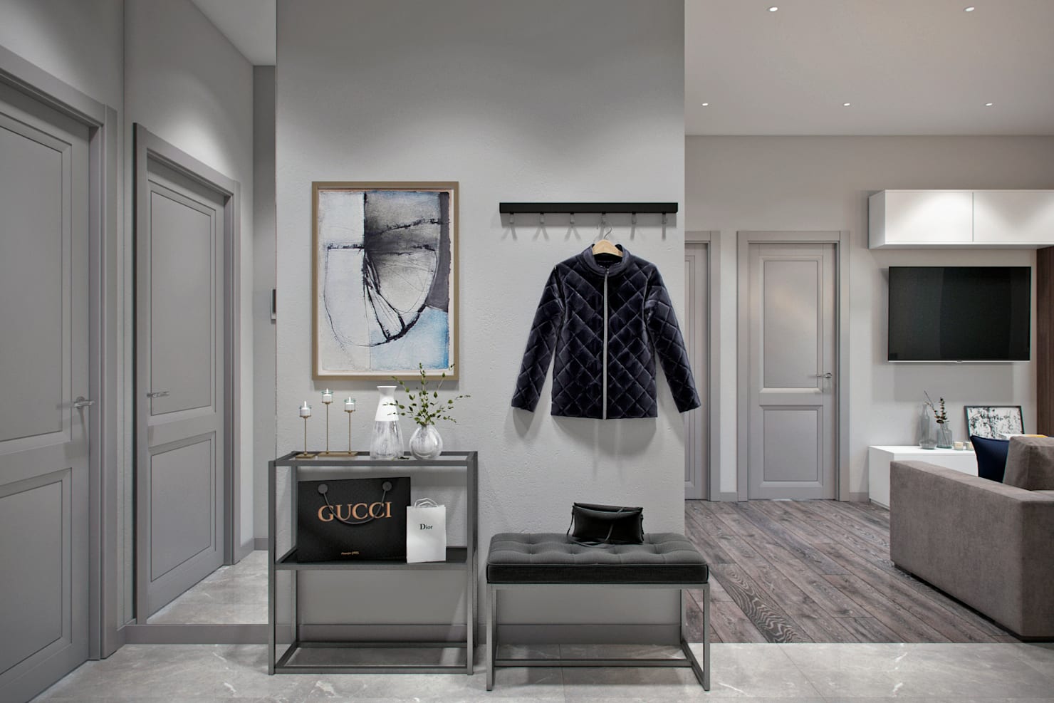 Интерьер прихожей в квартире-студии не терпит экономии на материалах, поскольку необходима детальная проработка сразу всех составляющих – напольного покрытия, стен, потолка, освещения и мебели.
