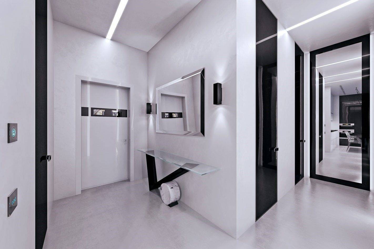 - Потайное освещение за плинтусами по периметру пола. Очень необычное решение для квартиры, но когда пол светится, это создает ощущение парения стен в воздухе и создает совершенно фантастическую атмосферу. Отлично подходит, если вы хотите оформить свою прихожую в космическом стиле.