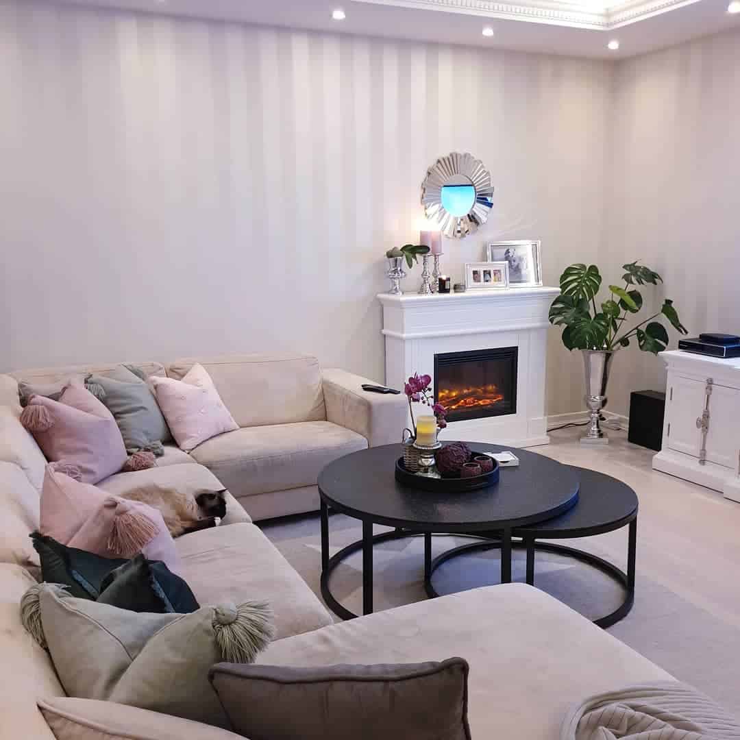 - В маленькой гостиной стараемся отказываться от сложных и громоздких конструкций (двухуровневые или подвесные потолки).
