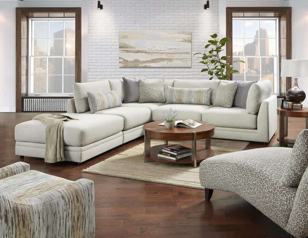Современная гостиная с большим мягким уголком и оригинальными модульными полками для хранения книг и аксессуаров