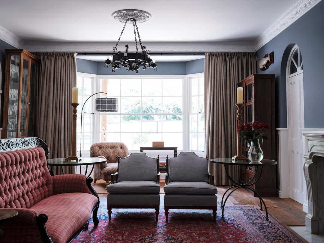 Гостиную 35 м2, совмещенную с кабинетом или библиотекой можно оформить в стиле кантри. Для отделки потолка и стен используйте натуральное дерево. Мебель должна быть грубой, неотшлифованной сборки. Дерево создает особую атмосферу, которая располагает для чтения книг или работы в стенах дома.